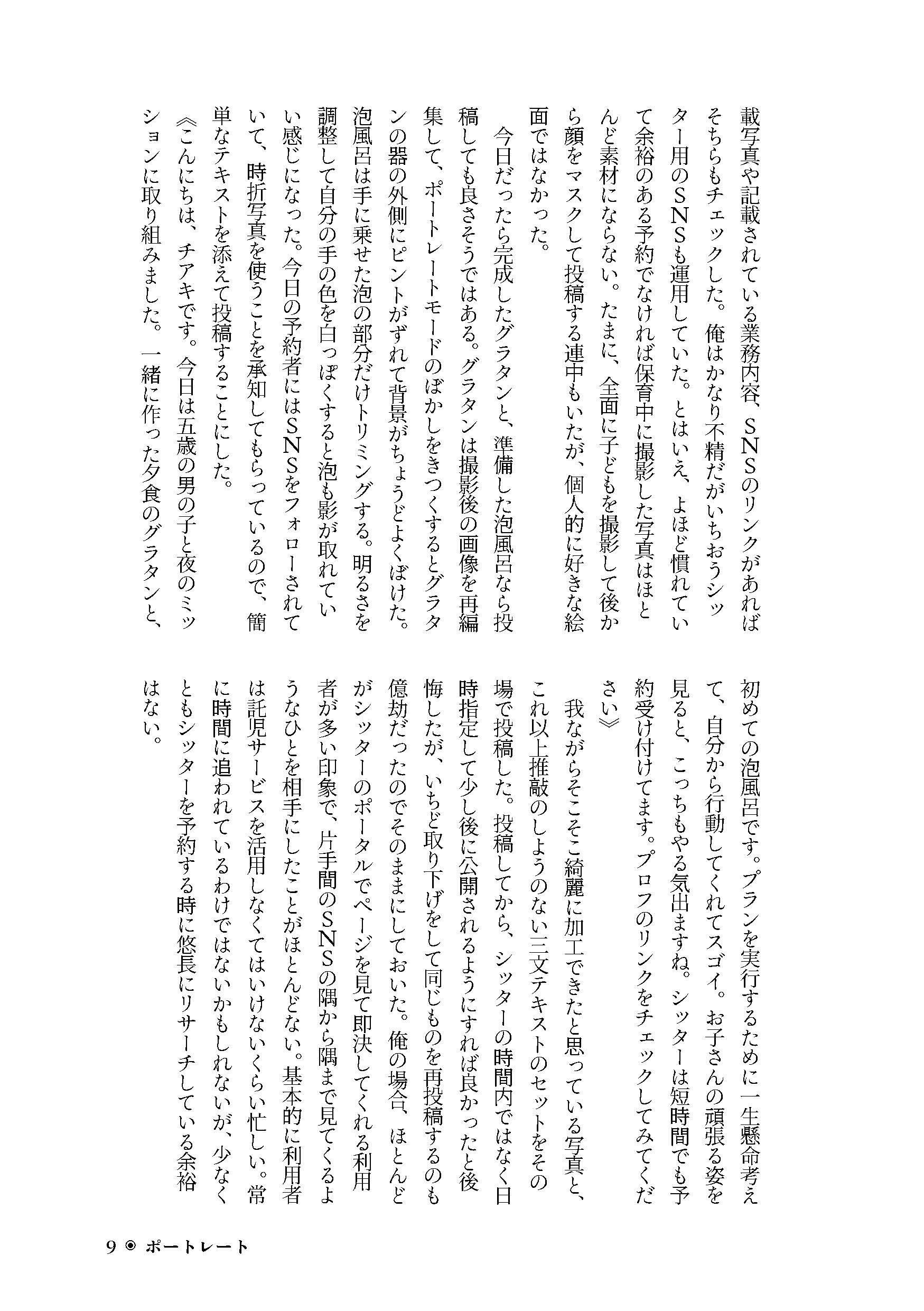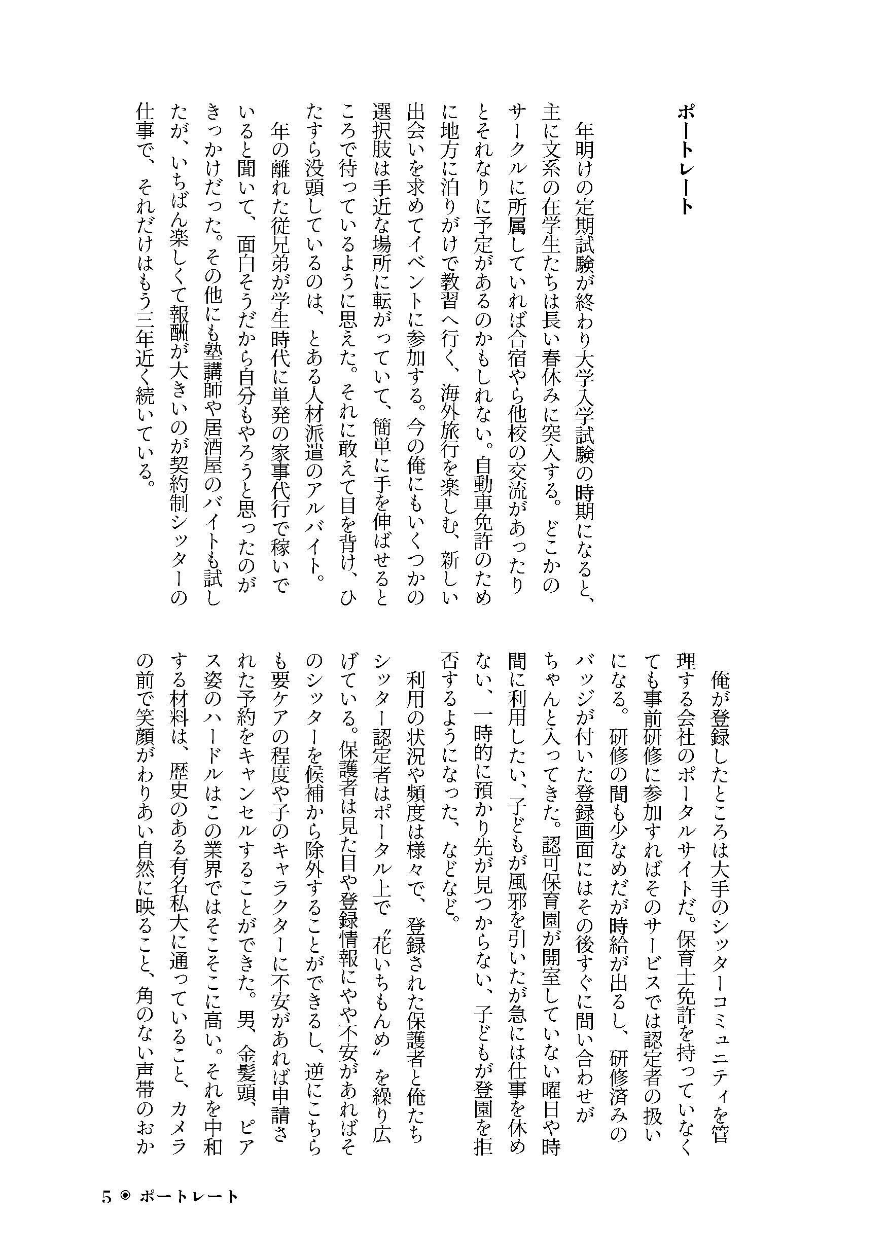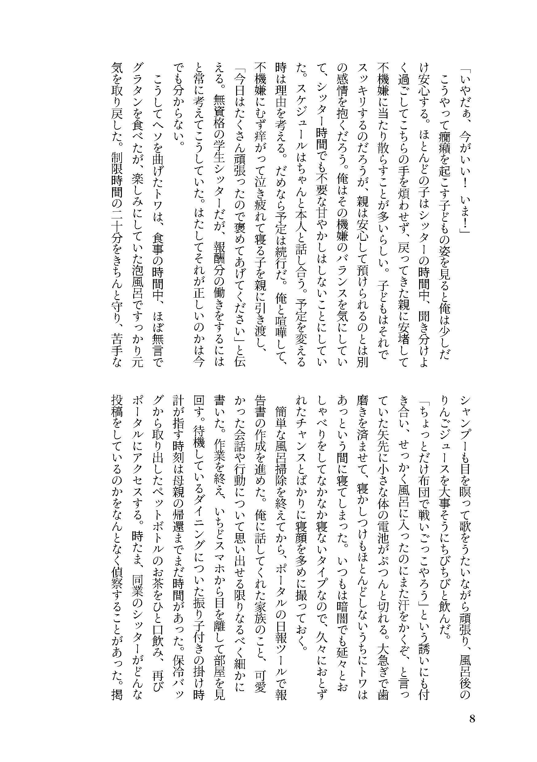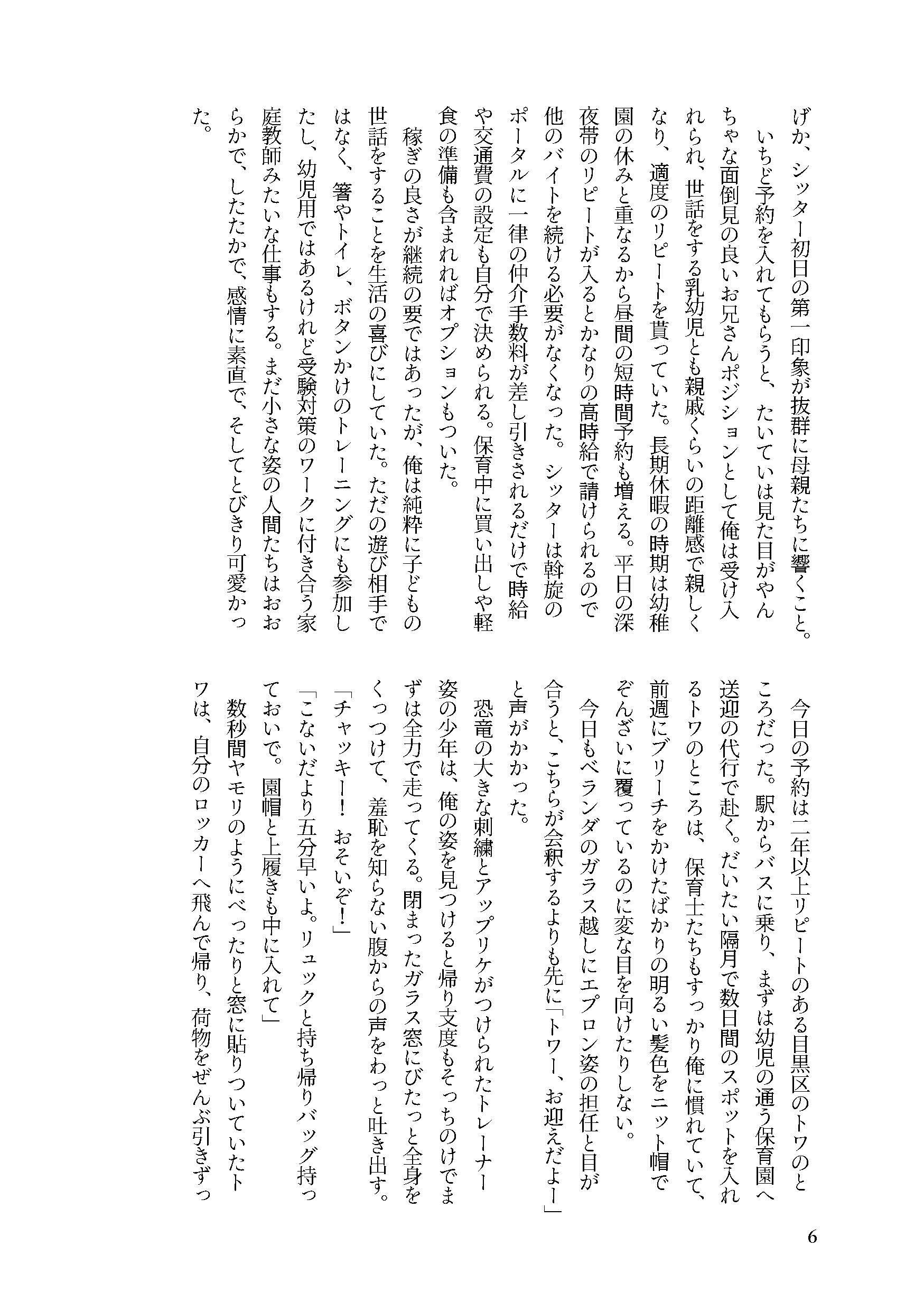大学生の灰野辺千秋はシッターのアルバイトに明け暮れている。派手な見た目だが常連の利用者がつくほど人気はそこそこだ。学校が長い春休みに入る冬の終わりごろがシッターの繁忙期で、千秋はシフトを詰め込み忙しなく働いていた。そんな時の新規利用者の予約、風邪が流行っている時期だからだろうと思うがどうにも違和感がある。 新規利用の高坂の家に行った日、生活感のない部屋の中で、クローゼットの中にいる息子とふたりきりの時間が始まる。息子の深青は幼児ではなく中学生くらいの少年だった。コミニュケーションが拙く、意思疎通の難しさを感じながら千秋は手探りで保育をしていく。食事中の粗相でやや場は乱されたが、代わりに千秋は深青の素顔を垣間見られたような気がした。しかし、保育が終わってからの心境の変化に、千秋自身がついていけなくなる。 シッターのバイトを辞めて渋谷のバーで働き始めた千秋は、ある日店の外で爆発音を聞き、事態の確認のために道へ出る。悪ふざけをしていた少年たちの中に紛れていた深青を偶然発見した。バーを抜け出して家まで送ると申し出るが、そこにいた深青は全くの別人で、保育者の千秋と父親を嘲笑する少年だった。千秋は怒りと自己正当化のために深青をレイプしてしまう。そのままタクシーに乗せて誘拐しようとする時、高坂の家で見た深青のもうひとつの人格が顕在していった。千秋は自分がしてきたことの無意味を知る。